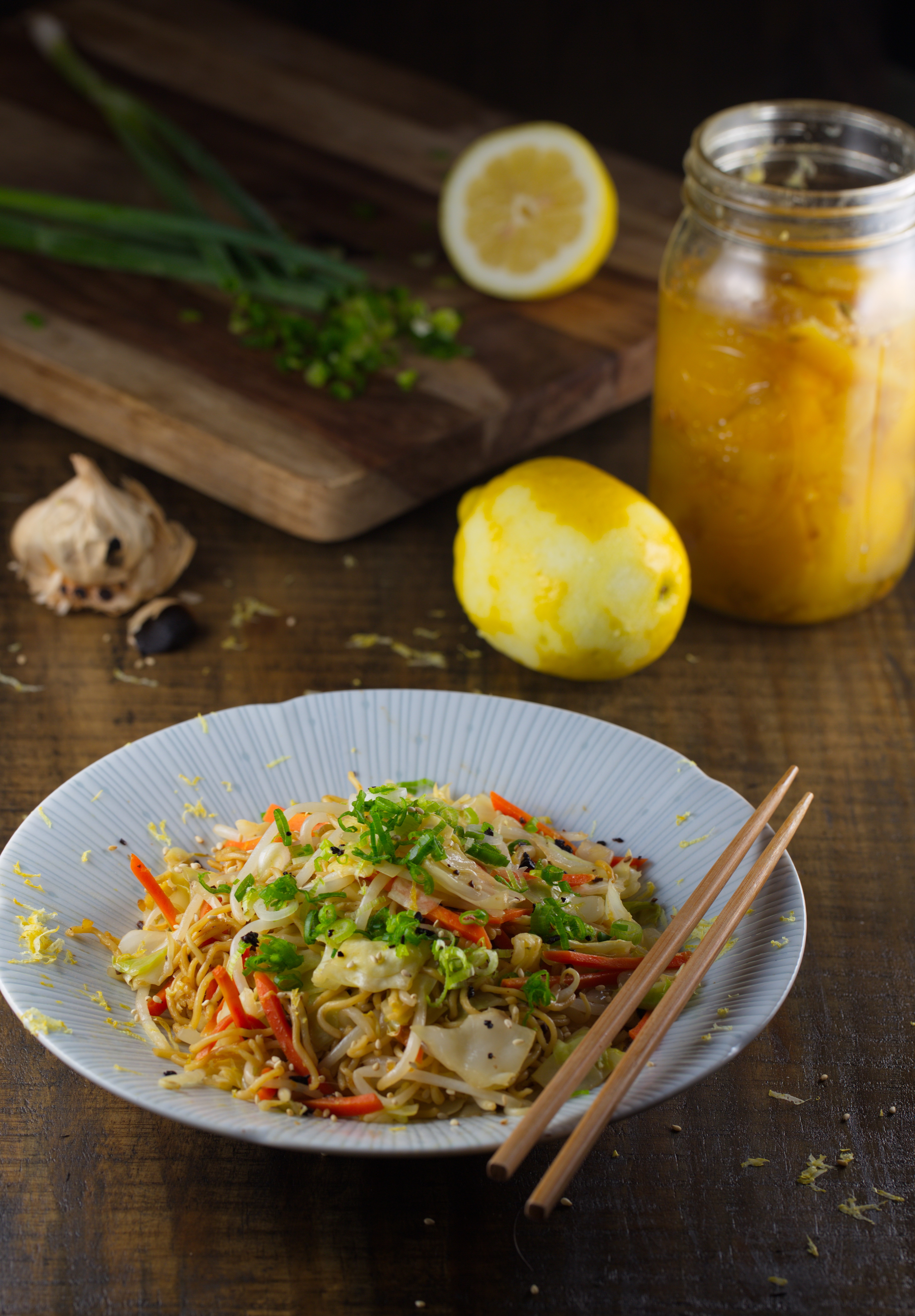 - Make a yakisoba sauce. Take a rind of a preserved lemon and mince finely. Mince finely a black garlic. Mix a preserved lemon, a black garlic, sake, salt, and lemon juice together.