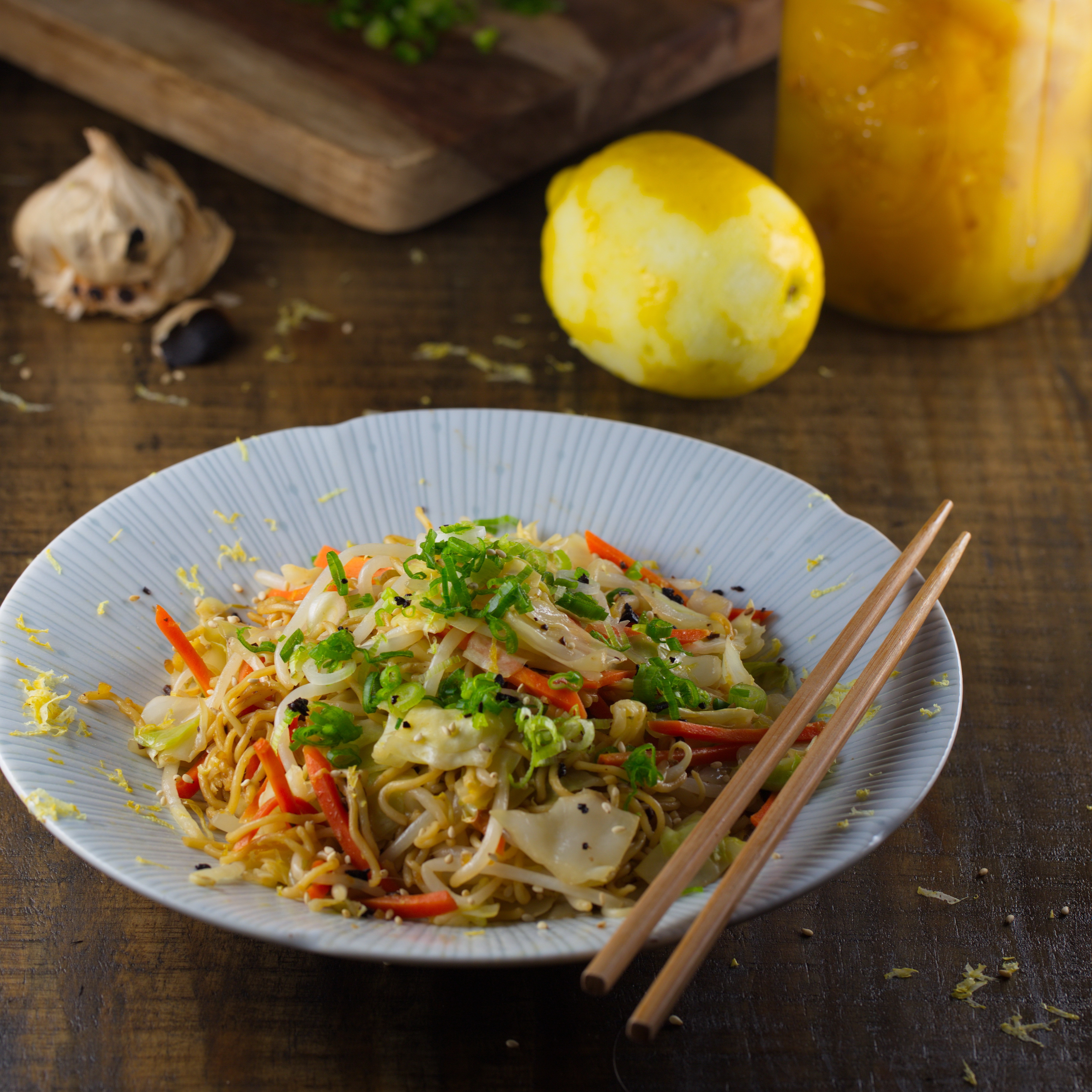 20 minute lemon sesame Yakisoba noodle with black garlic