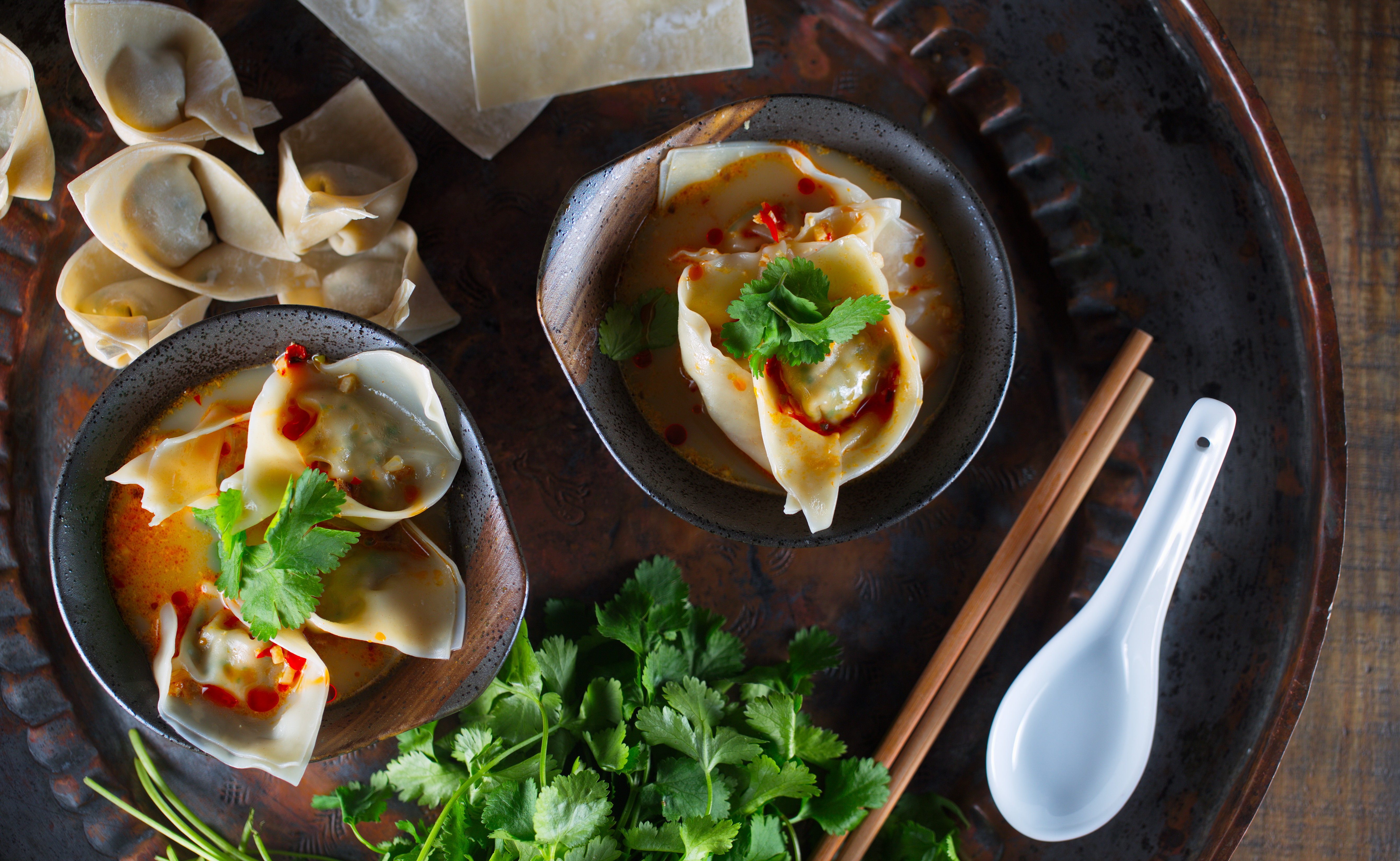 spicy chicken and cilantro wonton soupWonton soup is my favorite early dinner snacks in my childhood. Once in a while, I buy a large amount of ground meat, and make a lot of dumplings and freeze it. That way, I can have 10 minute dumpling meal any day for the rest of a month. It may take some work to make handmade dumplings, but it is totally worth it.